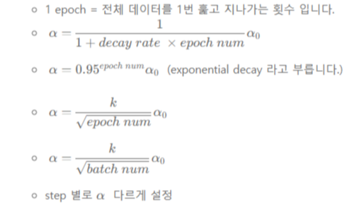 a = k(상수)/epoch_num의 제곱근*a_0 또는 k(상수)/미니배치의 개수 t의 제곱근*a_0