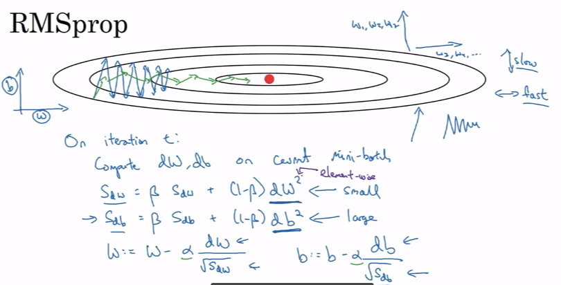 RMSProp 알고리즘이 하는 일은 다음과 같다. 반복 t에서 현재의 미니배치에 대한 보통의 도함수 dw와 db를 계산할 것이다. 지수가중평균을 유지하기 위해서 새로운 표기법인 s_dw를 사용하자. 이 값은 β*s_dw + (1-β)*dw^2 이다. 제곱 표시는 요소별 제곱을 나타낸다. 이는 도함수의 제곱을 지수가중평균하는 것이다. 그리고 s_db 역시 β*s_db + (1-β)*db^2와 같다. 다음으로 매개변수를 다음과 같이 업데이트 한다. w는 w에서 학습률 a*dw를 s_dw의 제곱근으로 나눠준 값을 뺀 것이다. b는 b-a*db만을 하는 대신에 s_db의 제곱근으로 나눠준 값을 뺀다.