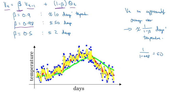 β가 0.9와 같을때, 지난 10일간의 온도에만 초첨을 맞춰 가중평균을 계산한다면 10일 뒤에는 현재 날짜의 가중치의 1/3으로 줄어들게 된다. 반대로 β가 0.98이라면 0.98^50이 대략적으로 1/e와 같다. 처음 50일 동안의 1/e보다 가중치는 더 커질 것으로 보인다. 감소는 가프르게 일어날 것이다. 따라서 직관적으로 50일의 온도의 평균은 더 급격히 빠르다. 왜냐하면 ε은 0.02이기 때문이다. 따라서 1/ε 은 50과 같다. 이는 1/(1-β)와도 대략적으로 같다. 평균적인 온도가 몇 일 정도가 될지에 관한 상수를 알려준다. 이는 관습적으로 쓰이는 것이지 수학공식은 아님에 유의하자.