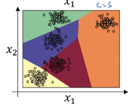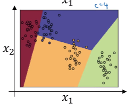 iv) C=4인 경우, 여기에서 소프트맥스가 선형 경계를 그리고 있다.