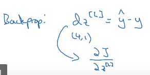 역방향전파나 경사하강법은 어떠했는지 생각해보면 역방향 전파에서 초기화를 위한 핵심단계 핵심이 되는 식은 마지막 층에서 z^[L]의 미분이 (4,1) 벡터인 y를 뺀 것과 같다. 클래스가 4개 일 때 모두 (4,1) 벡터가 되는 것이다(일반적으로는 (C,1) 벡터임). 일반적인 정의를 빌리자면 여기서 dz^[L]은 비용함수 z^[L]에 대해 편미분한 것이다. 미적분으로 유도가능하지만 이 공식을 이용해도 된다. 이런 식으로 시작해서 신경망 전체에 대한 미분을 역방향전파로 구하는 것이다.