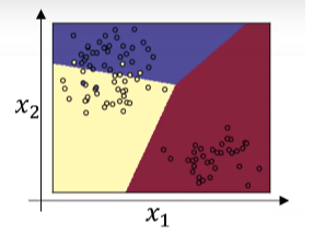 iii) 이는 또 다른 분류다. 여기서 얻을 수 있는 직관은 두 클래스 사이의 경계가 선형이라는 것이다. 그래프를 보면 노란색과 빨간색 사이에도 선형 경계가 그려져 있고 보라색과 빨간색, 빨간색과 노란색 사이에도 선형결정 경계가 그려져 있다. 하지만 다른 선형 함수를 사용해서 공간을 세 개의 클래스로 나눌 수도 있다.