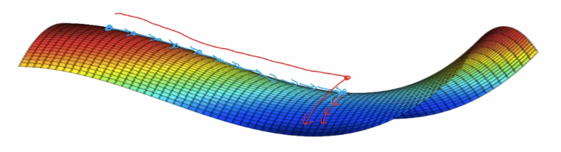 그럼 지역 최적값이 문제는 아니고 무엇이 진짜 문제일까? 안정지대가 학습을 아주 지연시킬 수 있다. 안정 지대는 미분값이 아주 오랫동안 0에 가깝게 유지되는 지역이다. 만약 그림의 왼쪽 표시에 위치한다고 하면 경사하강법에 따라 면을 따라서 아래로 움직인다. 여기서 경사가 거의 0에 가까울테니 면이 거의 평평할 것이다. 여기서 아주 오랜 시간이 걸리게된다. 왼쪽이나 오른쪽에 무작위로 작은 변화가 주어지면 빨간색 화살표처럼 알고리즘이 안정지대를 벗어날 수 있다. 하지만 하늘색의 마지막 지점에 도달하기 전에 아주 긴 시간동안 경사를 탄 후에야 안정지대를 벗어날 수 있다.