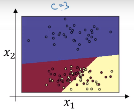 이렇게 은닉층이 없을 때 소프트맥스 분류 함수가 하는 일을 살펴보았다. 만약 은닉 유닛이 여러개인, 더 깊은 신경망을 다룬다면 여러 클래스를 분류하기 위해 더 복잡하고 비선형의 경계도 볼 수 있다.