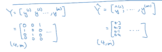 마지막으로 구현에 관해 살펴보자면 C=4이고 (4,1) 벡터인 상황에서 y^도 (4,1) 벡터이다. Y라는 행렬은 y^[1], y^[2]부터 y^[m]이 된다. 위에서 했던 샘플이 첫번째 훈련샘플이라고 한다면 첫번째 열은 0 1 0 0 이 된다. 두번째 샘플은 개가 되고 세번째 샘플은 기타이며 (설명하기위해 임의로 설정) ... 계속한다. Y는 결국 (4,m) 차원의 행렬이 된다.