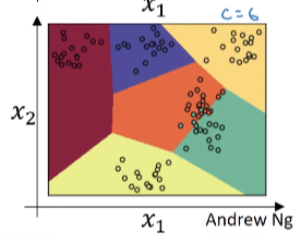 i) 이 예시에서는 입력값 x_1과 x_2에 대하여 이 결정 기준을 나타내는 c=3의 클래스를 가진 소프트맥스 층을 사용했다. 여기서 선형적인 기준에 따라 데이터가 세개의 클래스로 나뉜다. 우리가 했던 것은 이 그림처럼 학습세트를 가져와서 비용 함수와 세 개의 선택지에 따라 분류하는 소프트맥스 함수를 학습시키는 것이다. 색깔은 소프트맥스 분류 함수에 따라 출력값을 나타낸 것이고 입력값은 가장 높은 확률의 출력값에 따라 색을 입혔다. 선형기준을 가지고 있는 로지스틱 회귀의 일반적인 형태이다. 하지만 클래스는 0,1 또는 0,1,2가 될 수 있다.