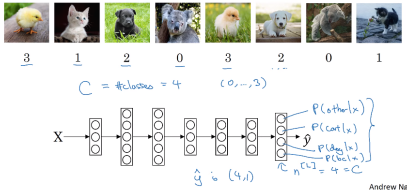 그리고 아래와 같은 신경망을 하나 만들었다고 가정하자. 출력층에는 C개(이 경우 4개의 출력 단위가 있는 신경망), 출력층 L의 단위 개수인 n은 4, 또는 일반적으로 C가 될 것이다. 우리는 각 단위와 상위층에서 각 클래스의 확률을 알려줬으면 한다. 첫번째 단위에서 우리가 원하는 출력값은 입력값 X가 주어졌을 때 기타 클래스, 두번째 단위에서는 고양이의 확률, 세번째 단위에서는 개의 확률, 네번째 단위에서는 병아리의 확률이다(병아리는 BC로 줄여 필기).