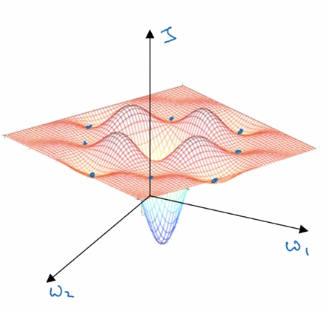 사람들이 지역 최적값에 대해 고민할 때 아래 그림을 생각한다. 여러분이 w_1과 w_2라는 매개변수를 최적화한다고 할 때 이 면적의 높이가 비용함수다. 이 그림에서는 지역 최적값이 많아보인다. 경사하강법 등의 알고리즘이 전역 최적값에 도달하기 전에 지역 최적값에 갇혀버리기 쉽다. 이렇게 2차원에서 그림을 그린다면 서로 다른 지역 최적값이 많은 그림을 쉽게 접할 수 있다. 이렇게 낮은 차원의 그림을 통해서 직관을 얻곤 한다. 하지만 직관이 항상 옳지만은 않다. 경사가 0인 점은 대부분 지역 최적값이 아니라 비용함수가 0인 경우 대개 안장점이다. 경사가 0일 점 중에 하나인 것이다. 사실 고차원 함수에서 경사가 0이면 각 방향에서 볼록함수나 오목함수가 되기 마련이다.