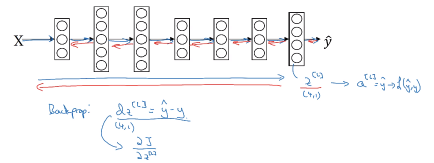 마지막 출력층이 z^[L]을 계산한다. (C,1) 차원이 되고(우리 예시에서는 (4,1)차원임) 여기에 소프트맥스 활성화 함수를 취해서 a^[L] 또는 y^을 얻는다. 그 값을 이용해서 손실함수를 계산할 수 있다. 이전에 신경망의 정방향 전파를 배웠었다. 정방향전파는 손실함수를 구하는데 사용했었다.
