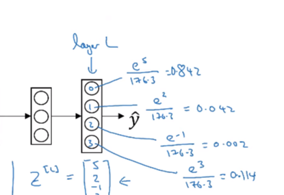 이제 z값을 계산하기 위해서 소프트맥스 활성화 함수라는 것을 사용해야 한다. 소프트맥스 층의 활성화 함수는 조금 다르다. 우선 각 원소에 대해 계산하는데 t=e^(z^[L])이라는 임시 변수를 사용한다. 즉 z^[L]이 (4,1) 차원의 벡터인데 t는 z^[L]의 각 원소에 e를 취한 것이다. 즉 결과도 (4,1)이 된다. 그러면 출력값인 a^[L]은 벡터 t와 같다. 다만 합이 1이 되도록 모든 임시 변수값들의 합을 나눠서 정규화한다. (즉 a^[L]은 z^[L]을 j가 1부터 4까지(원소가 4개이므로) t_j를 모두 더한 값으로 나눈다. 그러면 a^[L]은 (4,1)벡터이고 이 벡터의 i번째 원소(a^[L]_i)는 t_j를 t_i 값들의 합으로 나눈 것과 같다)