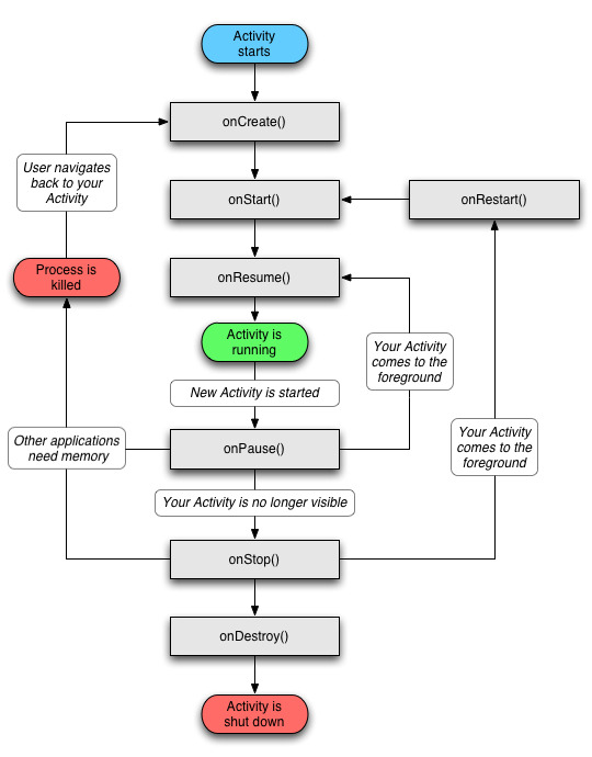 - onStart(), onResume() : 시작할 때 뿐만 아니라 activity가 가려졌다가 돌아올 때도 실행된다. 다른 화면에서 입력받은 내용을 통해 바뀔 수 있는 데이터를 초기값 설정 또는 갱신하는 구문들이 포함된다.