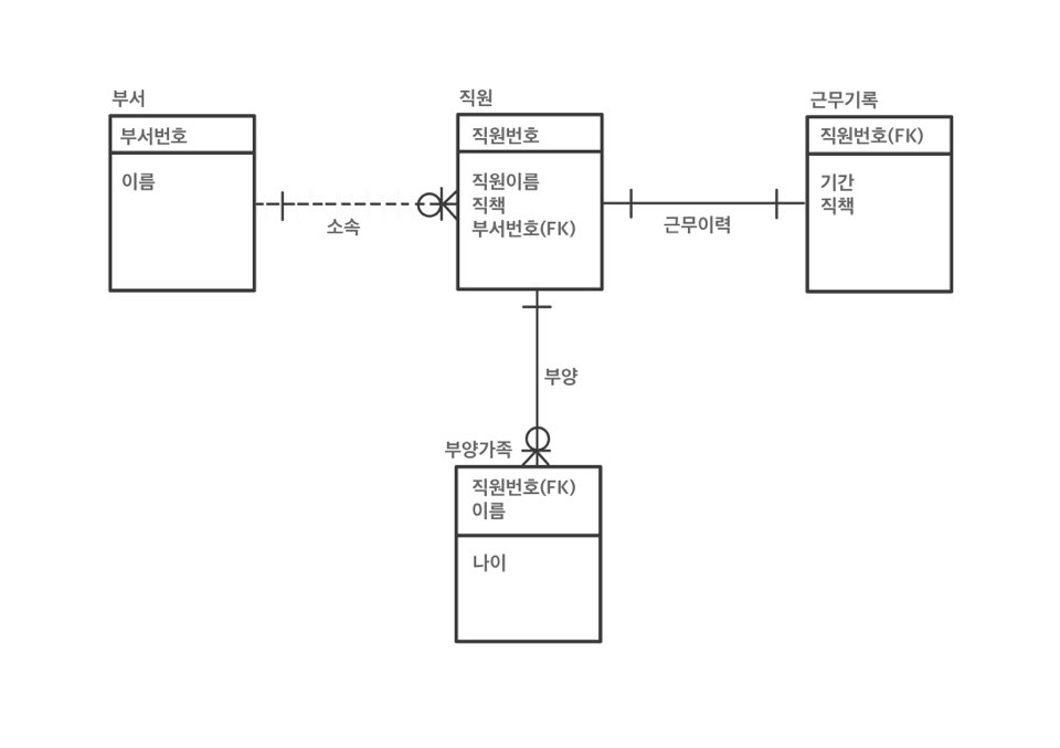 부양가족(직원번호(FK), 이름, 나이)